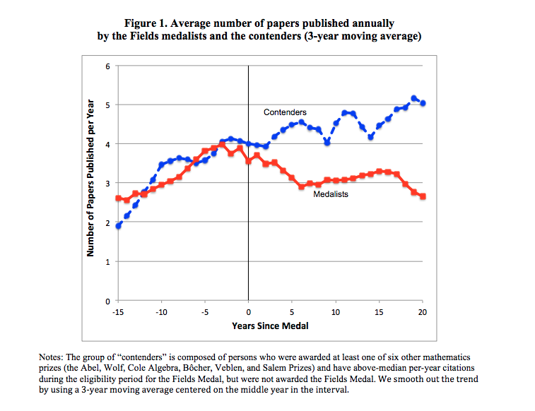 Two economists have recently posted a paper arguing that Fields Medalists’ productivity decreases after they get their Fields Medal. While this certainly seems plausible psychologically (after all, proving minor theorems might seem anti-climactic after you’ve solved the major open problem in your field), when I looked at this paper, it seemed that the statistics in it were very naive, in that the authors completely ignored any possible post-conditioning; this leads me to believe that the conclusion is quite likely to be wrong. I have two questions: