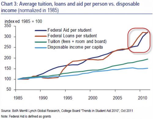 Over the last almost fifty years, tuition inflation has been ridiculous. When I first went to the University of Michigan in 1965, the tuition for full-time, in-state was something like $217 a semester. Something has to give. I agree with your assessment that the government aid has just allowed universities to continue to hike tuition because students have a way to pay it.