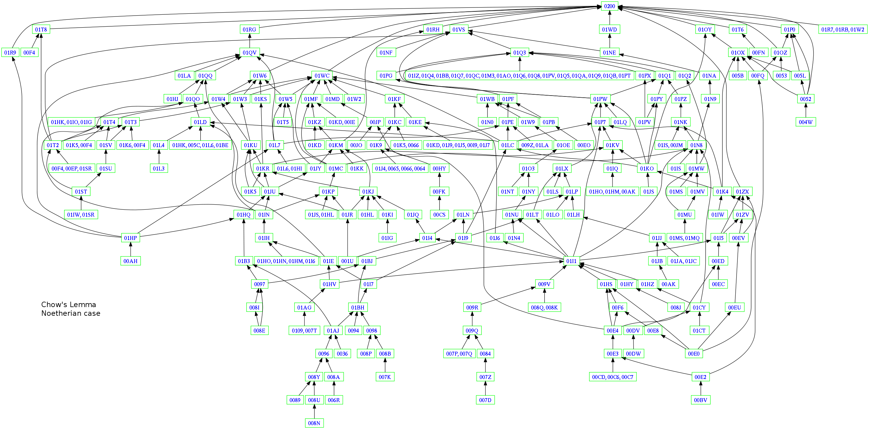 Here’s another picture which labels each vertex with a tag. I designed the tag system, which gives each theorem a unique identifier; the hope is that people will be willing to refer to the theorems in the project even though their names and theorem numbers may change (i.e. Theorem 1.3.3 may become Theorem 1.3.4 if someone adds a new result in that section). It’s also directed, showing you dependency (Theorem A points to Theorem B if you need Theorem A to prove Theorem B). This visualizes the results needed to prove Chow’s Lemma: