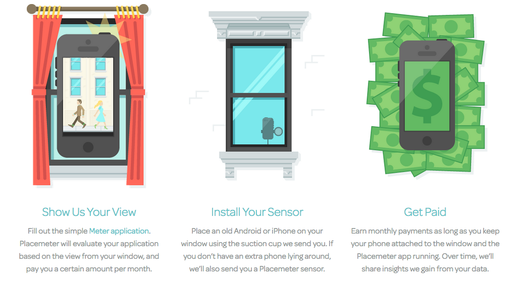 There’s a CNN video news story explaining how the NYC Mayor’s Office of Data Analytics is working with private start-up Placemeter to count and categorize New Yorkers, often with the help of private citizens who install cameras in their windows. Here’s a screenshot from the Placemeter website: