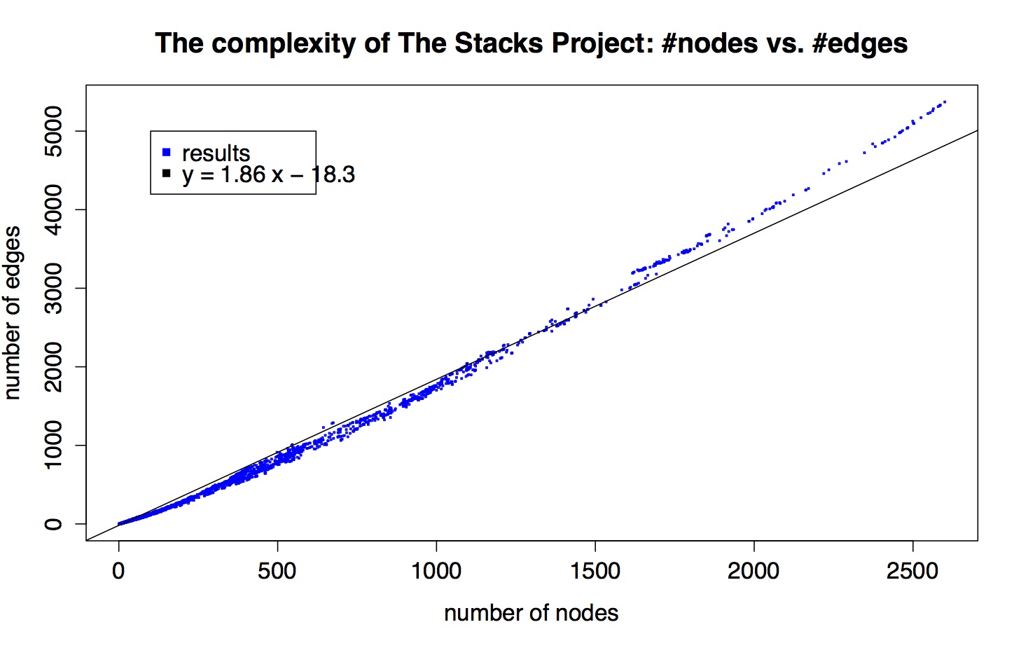I would guess the Stacks Project graph doesn’t have this property (though it would be interesting to hear from Cathy to what extent this is the case) and that in her scatterplot we are not measuring the same graph again and again.