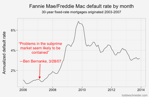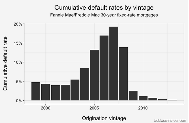 If you’re interested in more technical discussion, including an attempt to identify which loan-level variables are most correlated to default rates (the number one being the home price adjusted loan to value ratio), read the full post on toddwschneider.com, and be sure to check out the project on GitHub if you’d like to do your own data analysis.