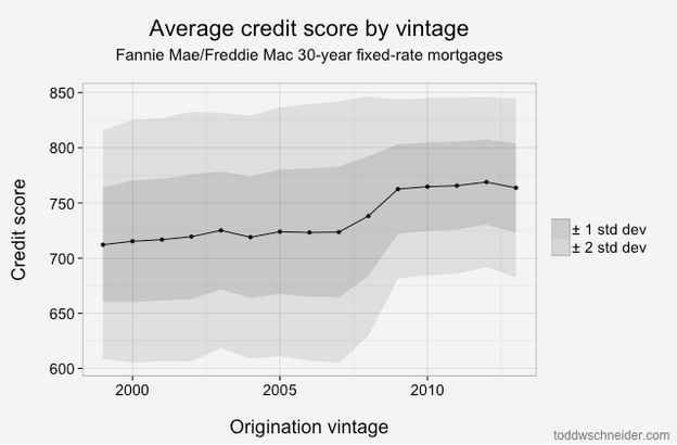 From 2009 through present, the performance has been much better, with fewer than 2% of loans defaulting. Of course part of that is that it takes time for a loan to default, so the most recent vintages will tend to have lower cumulative default rates while their loans are still young. But there has also been a dramatic shift in lending standards so that the loans made since 2009 have been much higher credit quality: the average FICO score used to be 720, but since 2009 it has been more like 765. Furthermore, if we look 2 standard deviations from the mean, we see that the low end of the FICO spectrum used to reach down to about 600, but since 2009 there have been very few loans with FICO less than 680: