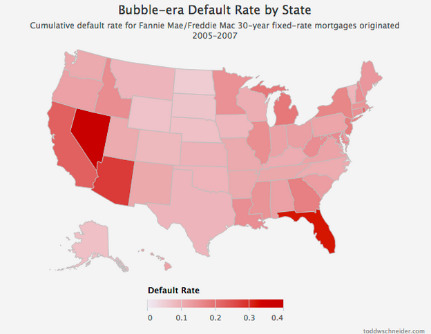 Default rates increased everywhere during the bubble years, but some states fared far worse than others. I took every loan originated between 2005 and 2007, broadly considered to be the height of reckless mortgage lending, bucketed loans by state, and calculated the cumulative default rate of loans in each state:
