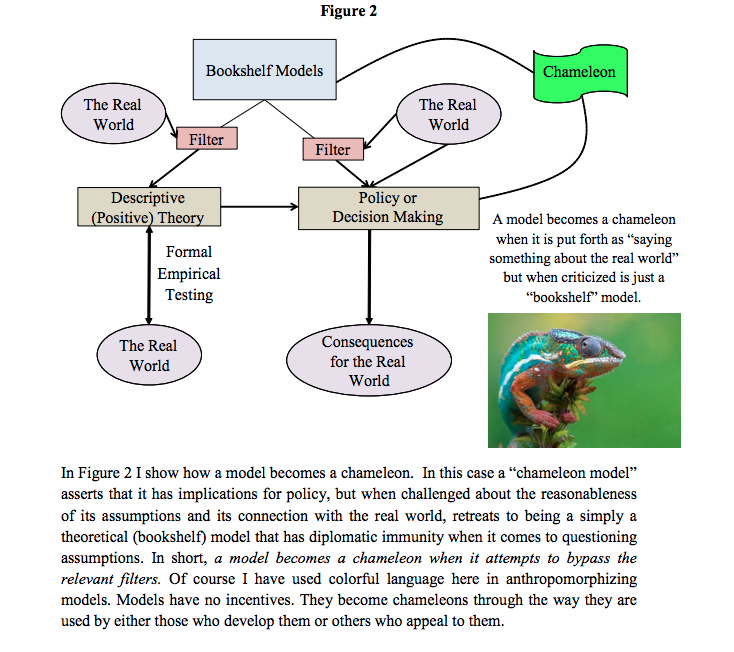 Pfleiderer provides some examples of chameleon models, and also takes on the Milton Friedman argument that we shouldn’t judge a model by its assumptions but rather by its predictions (personally I think this is largely dependent on the way a model is used; the larger the stakes, the more the assumptions matter).