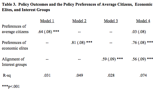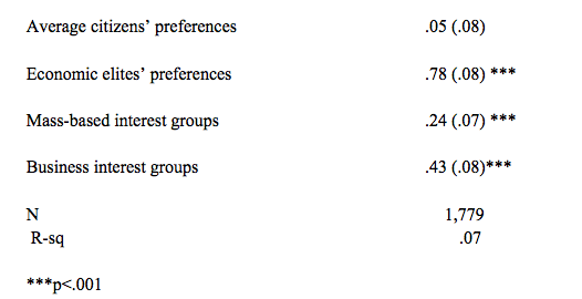 This is where we get our conclusion that average citizens don’t have independent influence, because of this near-zero coefficient in Model 4. But note that if we ignore elites and interest groups, we do have 0.64 in Model 1, which indicates that preferences of the average citizens are correlated with outcomes.