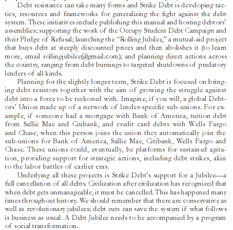 A newer group grown out of Occupy called Strike Debt is making waves with their newly released Debt Resistors’ Operation Manual, available to read here with commentary from Naked Capitalism’s Yves Smith and available for download as a pdf here.