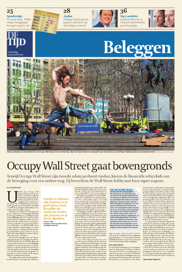 Hey I was interviewed last week by the Belgian newspaper De Tijd about Occupy Wall Street and the Alternative Banking group. Here are pdf versions of the first page and the second page, but I wanted to show the picture too, event though this jpeg version isn’t good enough to read: