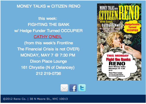 I’ll be in the Lower East Side tomorrow night, at the Dixon Place Lounge, talking finance with Reno, who some of you may know. Here’s more info: