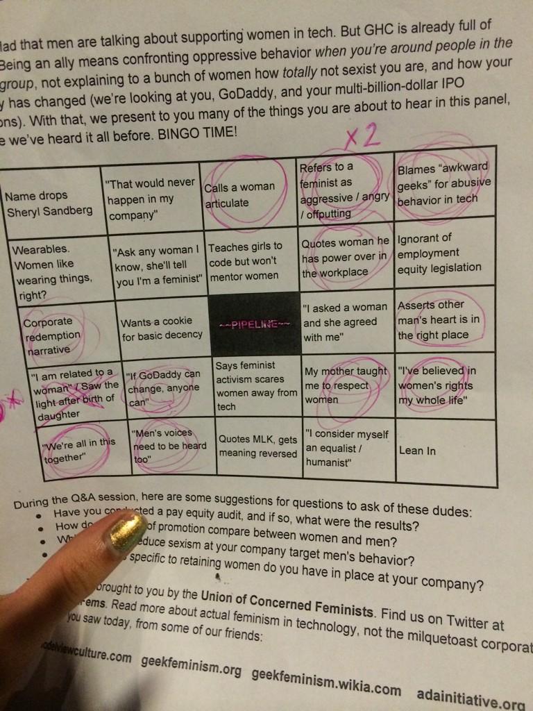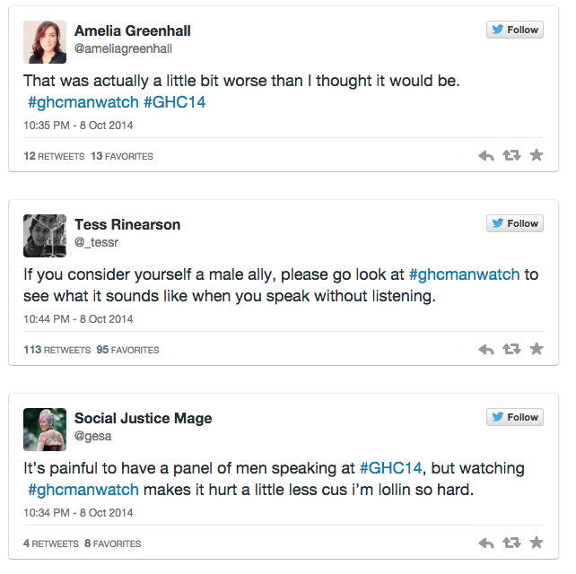 Chris Wiggins was kind enough to forward me this article on a recent panel discussion of “Male Allies of Women” at the 2014 Grace Hopper Celebration, which is a big deal conference for women in tech.